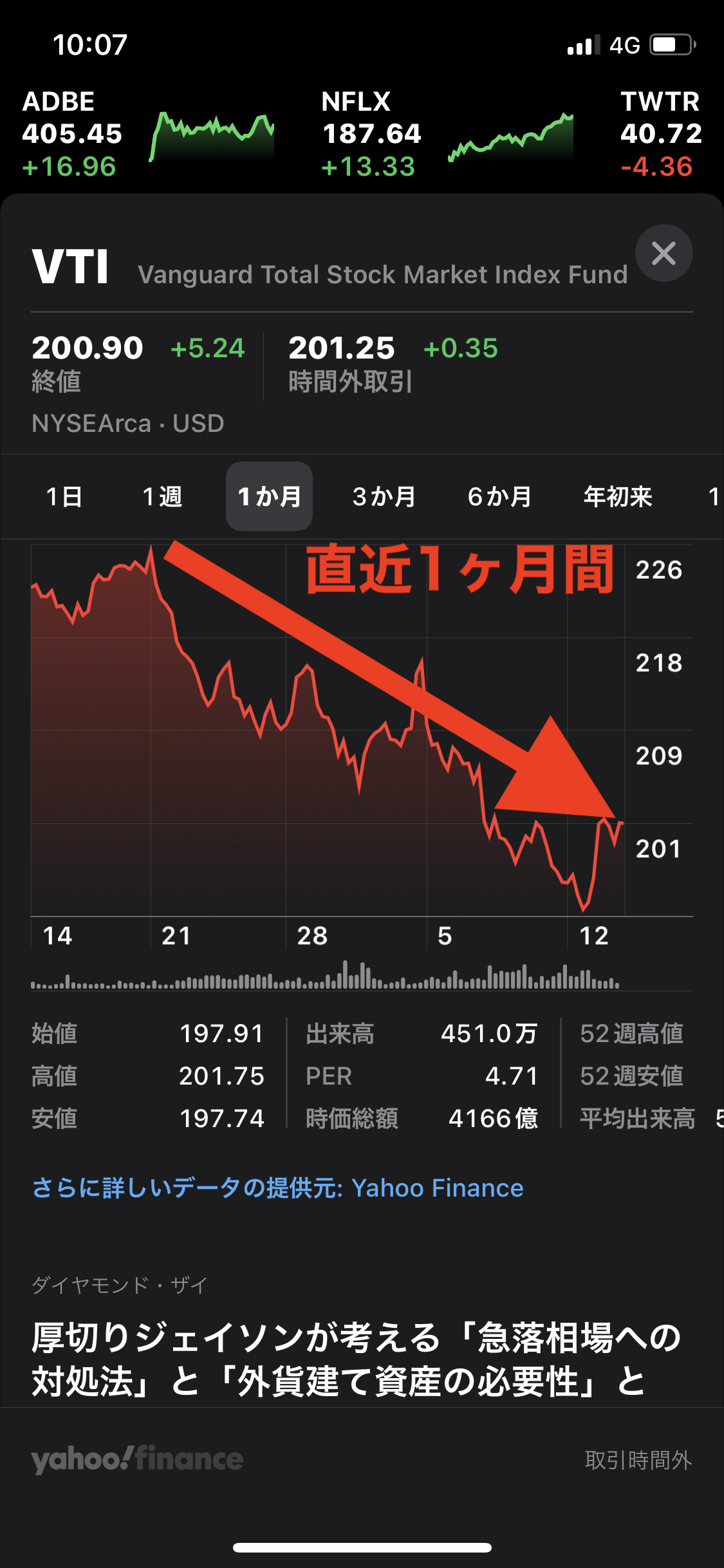 もう一度、VTIの「直近1ヶ月間」の値動きを載せます。
