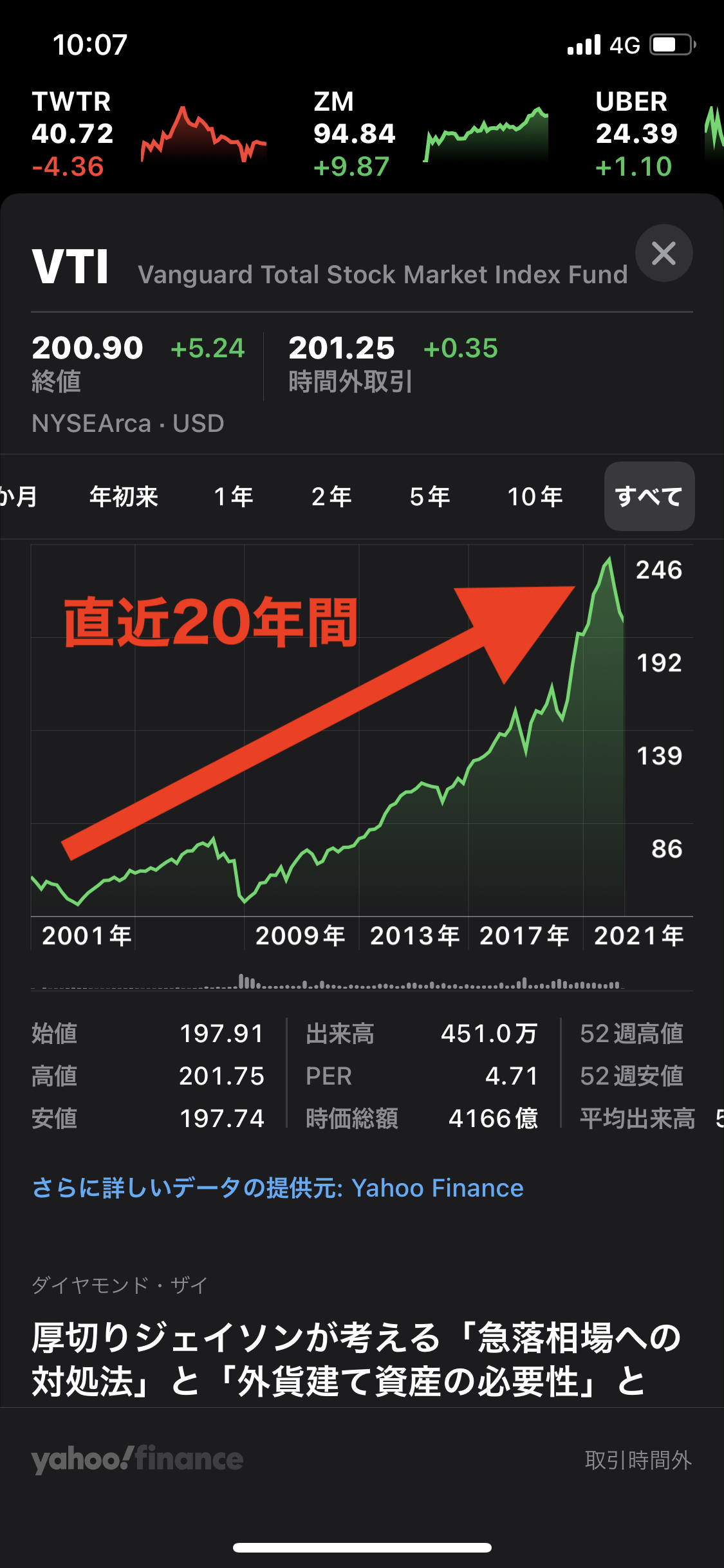 「直近20年間」で数年ごとに下落はあるものの、ずっと右肩上がりなのがわかるでしょう。これが、厚切りジェイソンさんが「長期」と言う理由です。