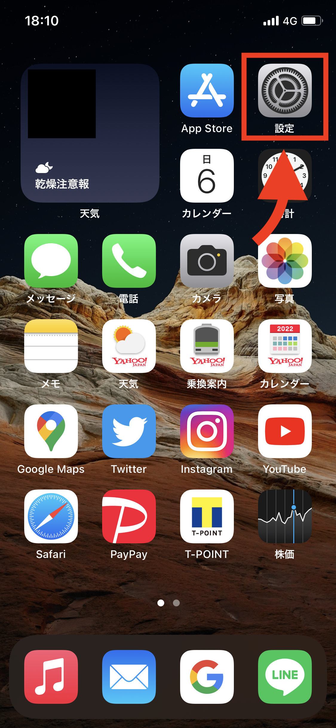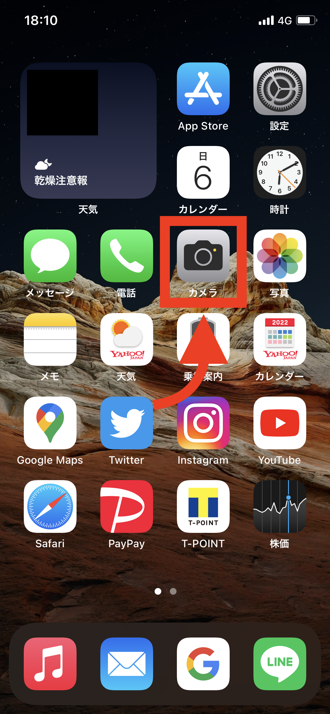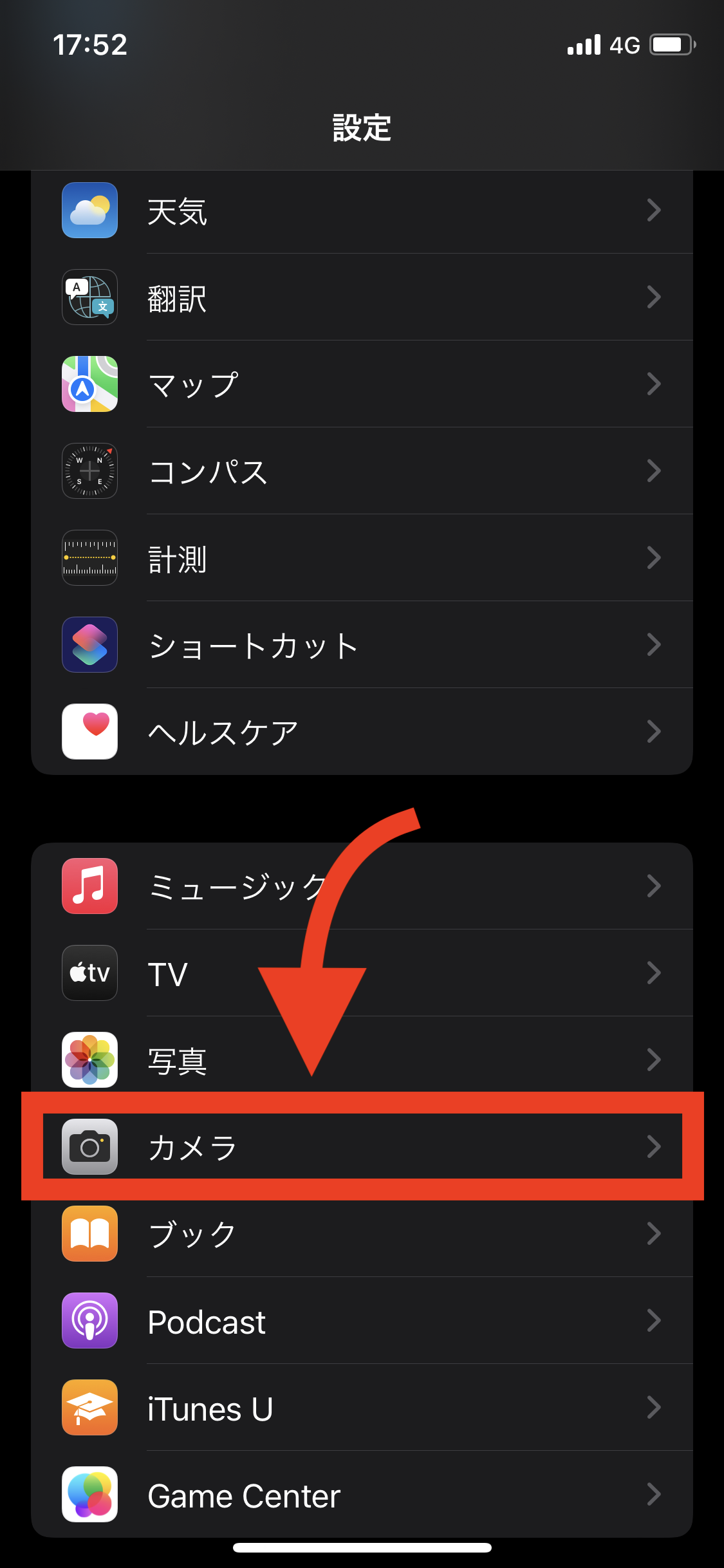 設定方法は、①ホーム画面から「設定」をタップします。下にスクロールして、②「カメラ」を押します。