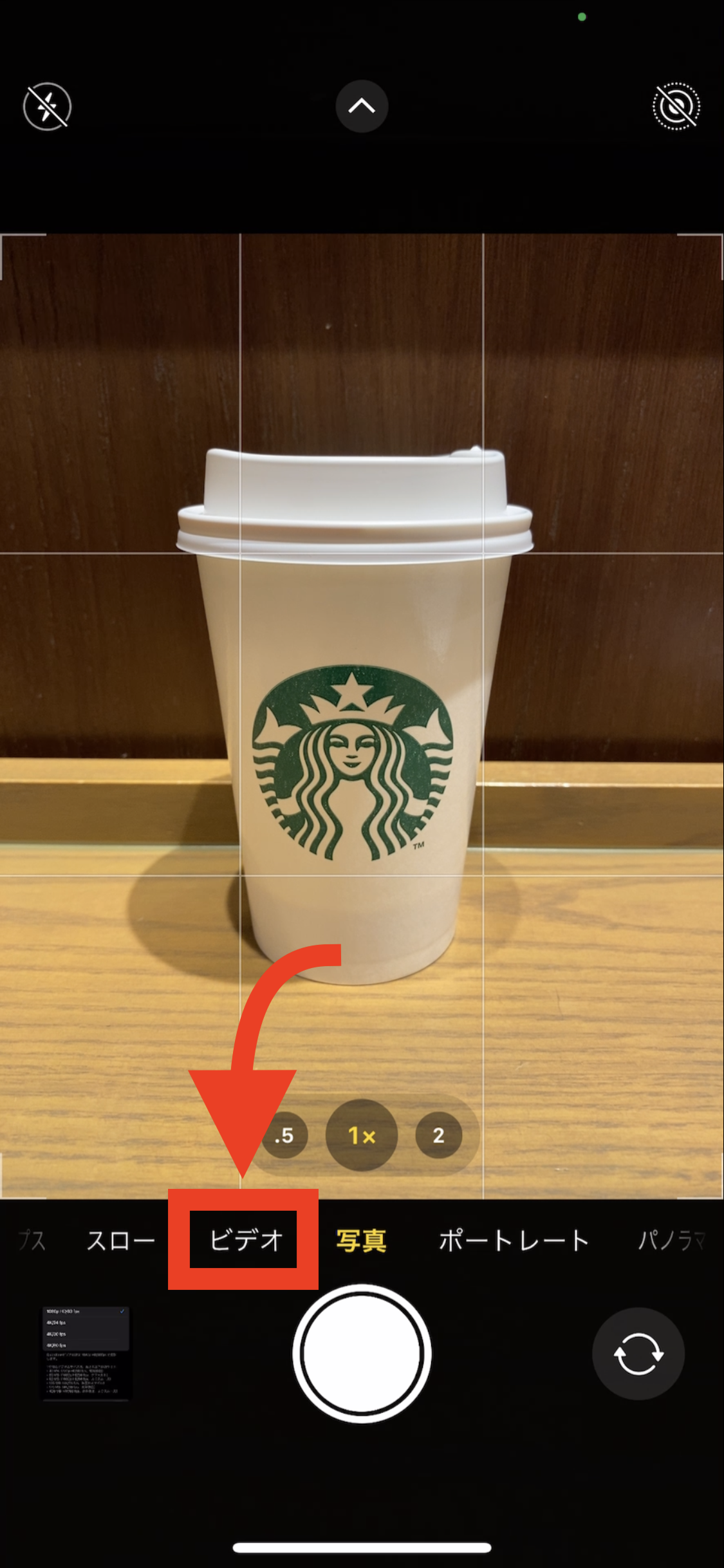 ①ホーム画面から「カメラ」をタップして、②「ビデオ」のモードに切り替えて撮影すればいいだけです。かんたんですね!